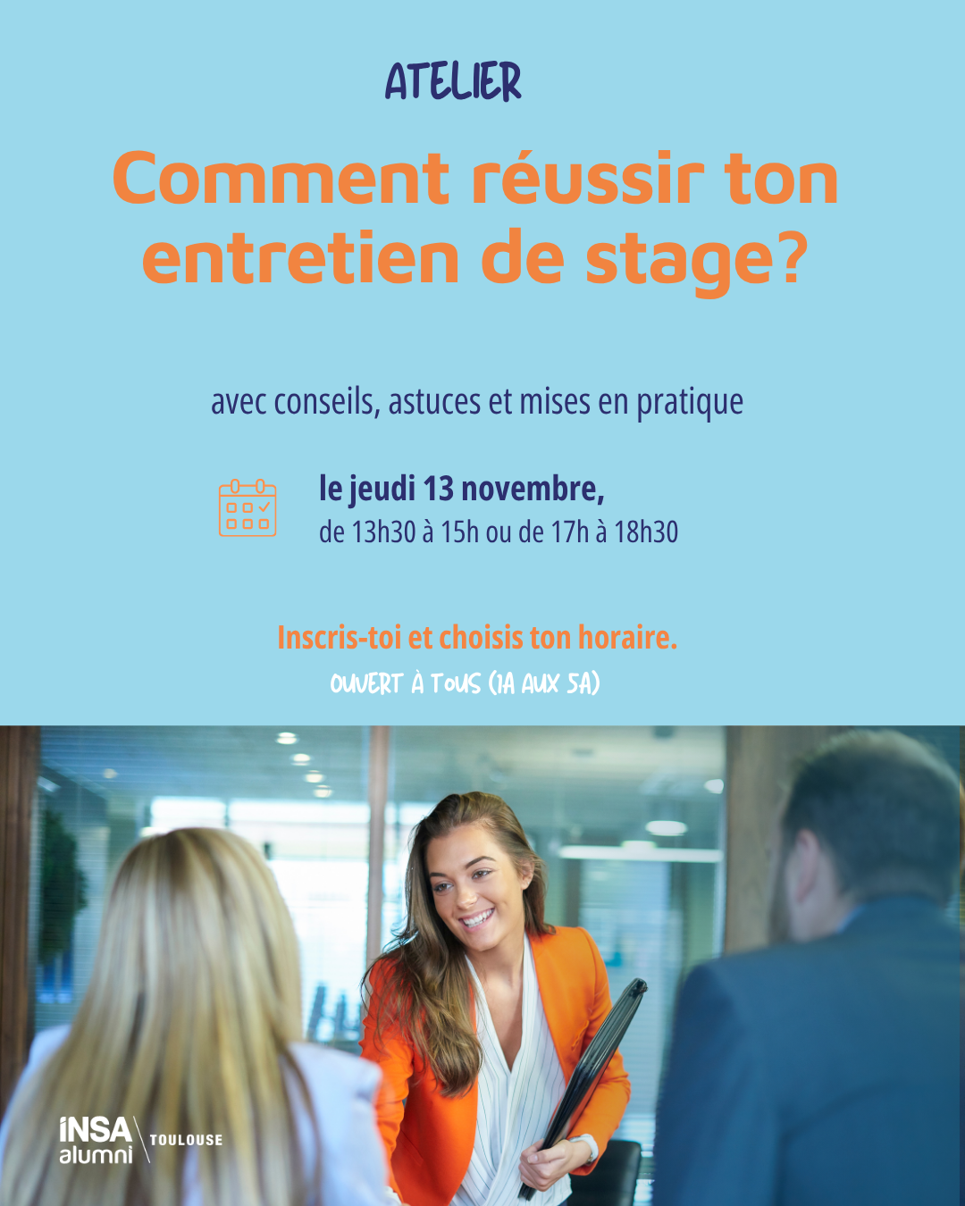 Suite au forum des entreprises du 21 octobre, INSA Alumni Toulouse propose un atelier de préparation aux entretiens de stage à destination des étudiants. Cet atelier sera animé par Laurence Bertona, ingénieure diplômée de l’INSA Toulouse et coach professionnelle expérimentée.
